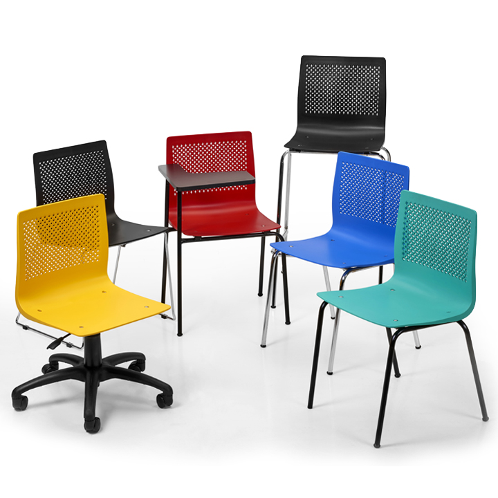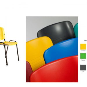 Opcionales: Plásticos en color: Amarillo, azul, blanco, gris, negro, rojo y verde. Estructura metálica de cuatro patas gris o negro. Regulación neumática de altura de asiento. Ruedas revestidas de material elastómero, muy silenciosa.